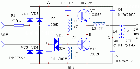 本電子變壓器工作原理與開關電源相似,電路原理圖見圖1(點擊下載原理圖),由VD1-VD4將市電整流為直流,再把直流變成幾十千赫茲的 高頻電流,然后用鐵氧休變壓器對高頻、高壓脈沖降壓。圖中R2、C1、VD5為啟動觸發電路。C2、C3、L1、L2、L3、VT1、VT2構成高頻振蕩部分。