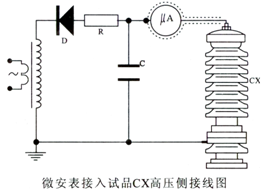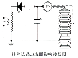 微安表必須有金屬屏蔽,應采用屏蔽與被試品聯接。高壓引線的屏蔽引出應與儀表端的屏蔽緊密聯接。如果被試品的表現污穢要排除被試品表面泄漏電流的影響可在被試品高電位端用裸體金屬軟線緊密繞幾圈后與高壓引線的屏蔽相聯接(見下圖)。