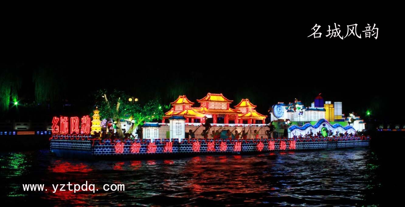 花船以古代城墻、傳統(tǒng)民居等元素體現(xiàn)揚州悠久的歷史文化,以唐代石塔、千年銀杏凸顯揚州的古城風韻,展示揚州古城保護成就。以新建的“通江門橋”及高樓林立展示絢爛多彩的“城市之光”,寓意歷史傳承與現(xiàn)代文明的有機統(tǒng)一,展示當代揚州人為建設古代文化和現(xiàn)代文明交相輝映的歷史名城的科學實踐。
