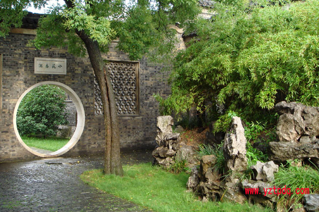 "小苑春深"與"迎曦"兩苑中間有漢白玉月洞門,兩邊有各式水磨磚細(xì)花漏窗分隔東西兩園,隔景透景合而為一。站在月門前東望小苑景色,石峰崛起,古柏參天,石榴枝繁葉茂如蓋張。高聳青灰絲縫云山式墻頂如游龍。西看小苑,曲廊幽榭,花廳書齋,牡丹臺上翠竹千竿,花木扶疏,書齋窗前,百年石榴老干如龍蛇走。