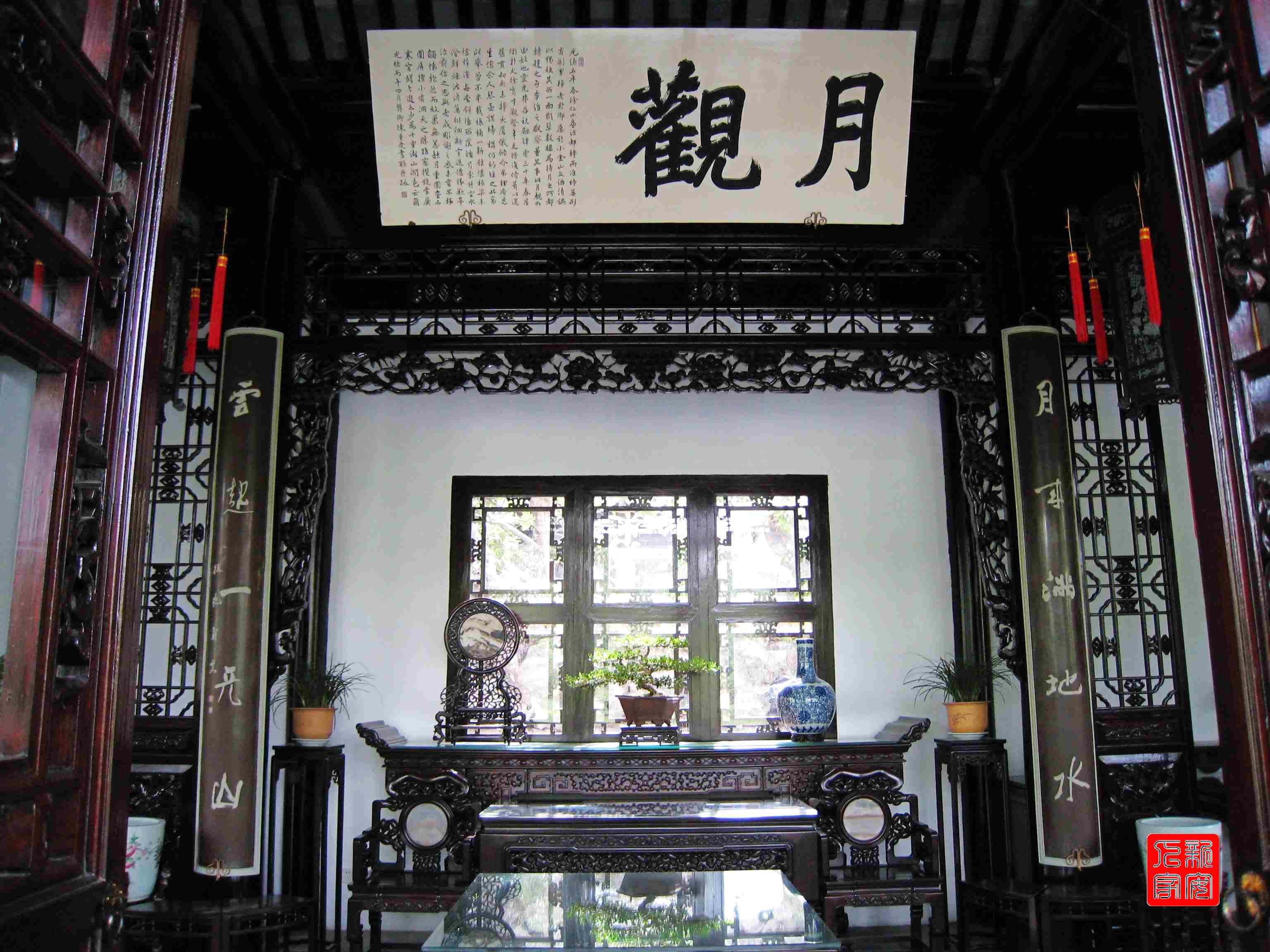 月觀中的海梅家具也很有特點,雕刻的內容都和賞月有關。那些蓮花、鴛鴦、荷葉,藕節,無不自然生動,是揚州木雕工藝的代表作品。