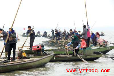 鞭炮聲中,40條漁船緩緩向湖中劃去,每條漁船上都有兩名漁民,一個負責(zé)劃船,一個負責(zé)罱魚。船行10分鐘左右,漁民們逐漸把船駛到湖中心。30分鐘后,在“圍長”的號令下,漁民向捕魚區(qū)域行進并形成“殺圍”圈,掀起罱魚高潮,一條條碩大的魚兒漸離水面時騰空而起,伴著水花飛濺,一條條活蹦亂跳的魚被漁民擒獲。1小時后,40條船共罱魚800斤左右。一條重38.8斤、長1.3米的大青魚成為本次冬捕“殺圍”節(jié)個頭最大的魚,一舉拿下“頭魚”的稱號。