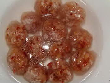 做藕粉圓子首先是制作圓子餡。將花生仁、芝麻仁、核桃仁炒熟焙干分別碾成細末。將紅棗或大棗煮爛去皮,加糖熬成糖泥后,分別與上述三種仁末同拌,做成小丸,成花生、芝麻、核桃餡料丸。將干藕粉散放在竹匾內,取丸餡在匾中滾動,粘上藕粉,取出,噴灑上微水,再入藕粉匾中滾過,再取出,再噴水,再滾過,直至藕粉圓子坯大小適當為好。也有人將圓子生坯沸水內一過,再入匾中滾藕粉增大。后者方法做圓子雖快,但圓子表面粗糙,大小也難以一致。做藕粉圓子的高手所做出的藕粉圓子看上去大小一樣,表面光滑,賞心悅目。吃到口里是軟、綿、糯、香。下藕粉圓子并不復雜,和下普通圓子基本相似。鍋內藕粉圓子在沸湯中浮起后,再加入一點冷水,再待湯沸鍋中的圓子全部上浮,呈半透明狀,圓子起暗紅色,即可用漏勺撈出盛到配有桂花糖鹵的碗中上席。